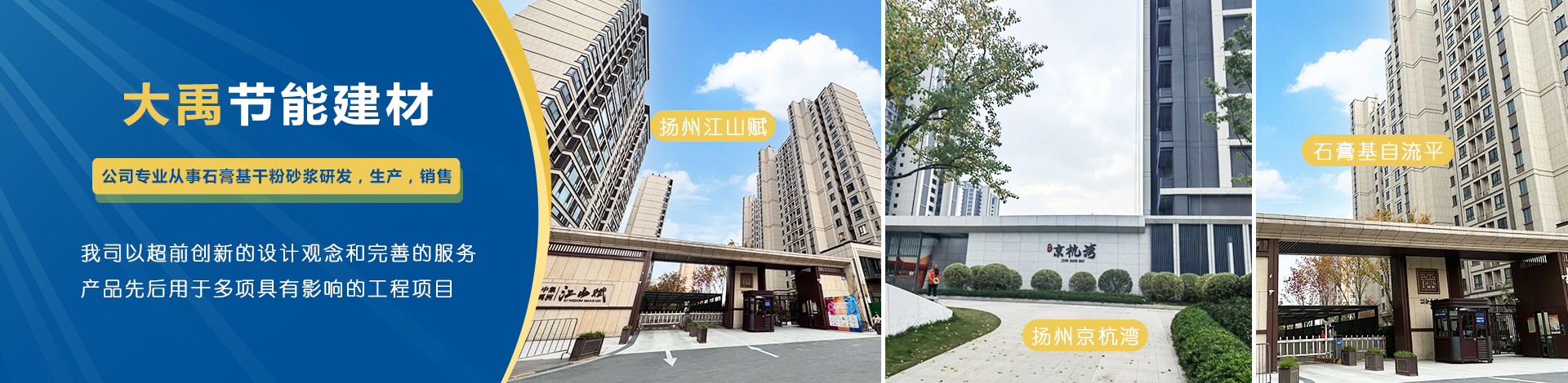 揚州市大禹節能建材科技有限公司成立于2005年9月,位于聯合國宜居城市---江蘇省揚州市,地處江都經濟開發區,與揚、鎮、泰三市接壤,交通十分便捷。公司是專業從事石膏基干粉砂漿研發,生產,銷售一體化的綜合性科技型企業,為國家標準GB/T2862-2012《抹灰石膏》的參編單位?! 」緭碛袊鴥纫涣鞯奶胤N砂漿生產線,并配有各種先進的檢測儀器,年生產能力可達10萬噸。各崗位管理及技術人員齊備,對產品···